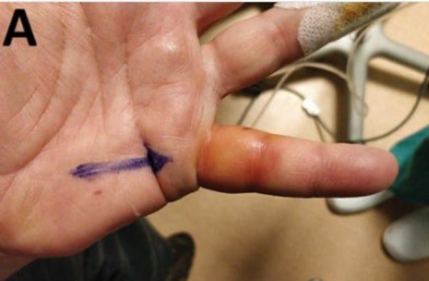 Ele sofreu uma reação imune intensa, semelhante a uma alergia, que resultou em inchaço nos braços, mãos e dedos.