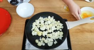 - Em uma frigideira aquecida, colocar um pouco de azeite e a couve-flor já cozida e picada para dourar.