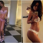 Na imagem, ela aparece vestindo uma lingerie muito fina e delicada, com detalhes em renda, usando os braços adornados com pulseiras para cobrir parte do corpo.