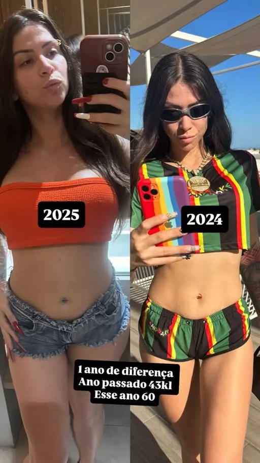 Antes, a funkeira pesava 43 kg. No clique mais recente, no entanto, MC Pipokinha aparece com 60 kg. A mudança é resultado de um processo de rotina de exercícios, alimentação balanceada e outras mudanças no estilo de vida.