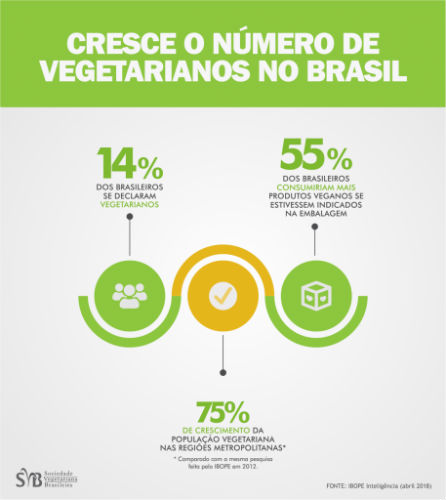Em pesquisa realizada em abril deste ano, o Ibope aponta que 14% da população brasileira se diz vegetariana, número que sobe para 16% em regiões metropolitanas como São Paulo, Rio de Janeiro, Curitiba e Recife. Em 2012, a mesma pesquisa apontava que o número de vegetarianos nestas cidades era de 8%.