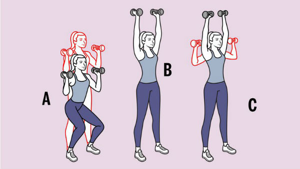 Dobre os joelhos e desça em um meio agachamento (A), depois empurre rapidamente as pernas e levante-se, levantando os pesos sobre os ombros (B); Baixe os pesos de volta. Este movimento todo é a primeira repetição. Faça o máximo possível em 30 segundos.