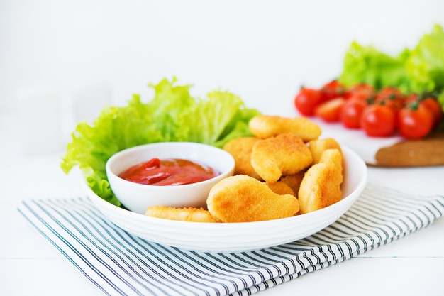 Em vez de comer nuggets industrializados, prepare o seu nugget caseiro. Corte a carne de frango em pedaços pequenos, ou passe pelo processador, adicione temperos e empane com migalhas de pão e leve ao forno para assar. Você também pode experimentar essa receita de nuggets de couve-flor.