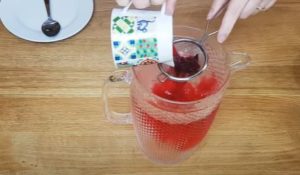 - Colocar o chá de hibisco em uma jarra de vidro, coando as folhas.