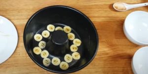 - Unte uma forma com óleo de coco e distribua as rodelas de uma banana por cima.