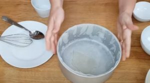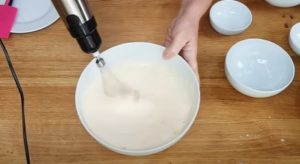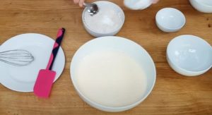 - Bater os ovos com o xilitol até ficar aerado. Acrescentar o leite, o óleo de coco e misturar até formar uma massa.
