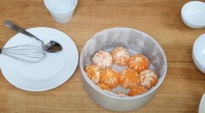 - Preparar uma calda com água e xilitol e despejar no fundo da forma. Colocar as tangerinas sem caroço por cima da calda.