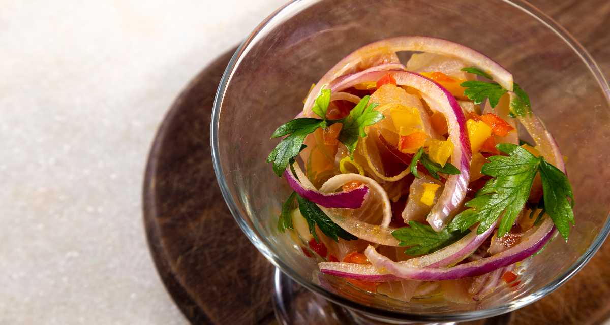 Famoso na culinária peruana, o ceviche é um prato em que pedaços de peixe cru são marinados no limão e ganham a companhia de temperos cheios de sabor. Ele é uma ótima opção de entrada para um almoço ou jantar mais chique.