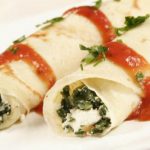 - Rechear as panquecas com a mistura de ricota com espinafre e enrolar. Colocar as panquecas em um refratário e despejar o molho de tomate por cima.