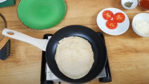 - Coloque uma parte da massa aberta em uma frigideira e pré-cozinhe por 3 minutos.
