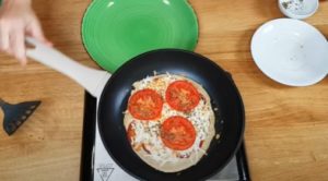 - Cubra com molho de tomate, muçarela, tomate e orégano. Deixe cozinhar por alguns minutos para derreter o queijo.