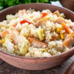 - Acrescentar o peito de frango já cozido e desfiado. Após refogar o peito de frango, despejá-lo em um refratário de vidro. Adicionar o chuchu e a cenoura já cozidos no vapor. Reservar.