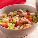 - Juntar o feijão cozido e escorrido com o tomate, a cebola roxa, o pimentão e o coentro em uma travessa. Misturar bem.