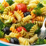 Por exemplo, um desses pratos é a salada de macarrão colorido. Na preparação, você mistura a massa com os benefícios do brócolis, a cenoura, o tomate, a cebola, o pimentão vermelho, a ervilha e a abobrinha.