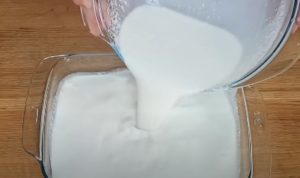 - Em outro recipiente, misturar o leite com o leite de coco, o creme de leite, o coco ralado e o xilitol (ou eritritol).