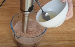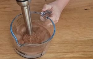 - Misturar na água o leite em pó, o cacau em pó, o xilitol (ou eritritol) e a essência de baunilha.