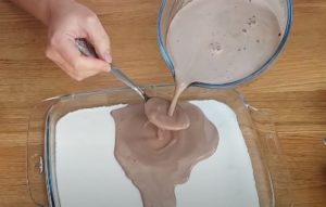 - Com o auxílio de uma colher, transferir para o refratário, espalhando por cima do pudim de coco. Levar à geladeira até firmar.