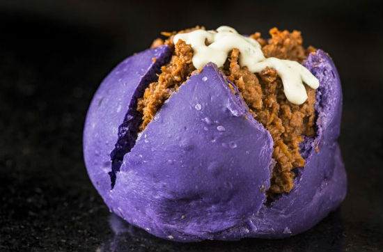 - Vulcano (foto): pão de cebola roxa, carne moída de soja e maionese vegana temperada: R$ 25,00