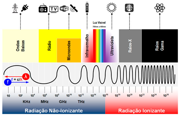 As linhas de energia operam entre 50 e 60 Hz, que ficam na extremidade inferior do espectro. Essas ondas de baixa frequência, juntamente com ondas de rádio, micro-ondas, radiação infravermelha, luz visível e parte do espectro ultravioleta, compõem o que é conhecido como radiação não ionizante.
