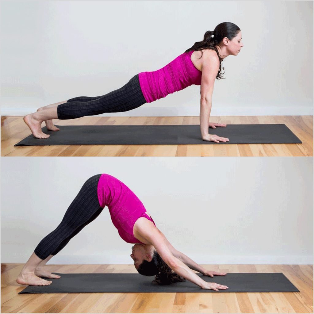 Então, mantendo o core (região central do corpo) acionado e os pés e as mãos fixos, elevar os quadris na posição do cachorro, de modo que forme um triângulo com o chão, como na imagem acima. O pescoço deve ser mantido neutro e o olhar deve ser direcionado aos pés, que nesse momento estarão retos no chão. Segurar a posição por um segundo e retornar ao posicionamento original da prancha alta.
