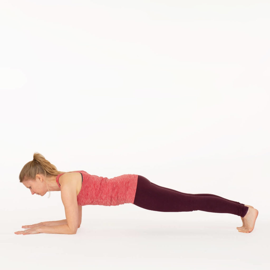 Como fazer: começar na posição de uma prancha alta: com as mãos estendidas no chão e empilhadas abaixo dos ombros, os braços retos e os pés próximos um do outro, apoiados apenas pelas pontas (dedos dos pés).