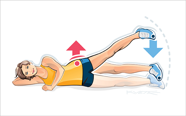 Como fazer: deitar-se de lado com as duas pernas retas – uma em cima da outra, com o pé de baixo descansando no chão, enquanto o pé de cima descansa em cima dele. Então, levantar a perna de cima lá no alto, conforme na imagem, mantendo a posição do corpo. É importante tomar cuidado para não deixar os quadris abrirem. Retornar ao posicionamento original.