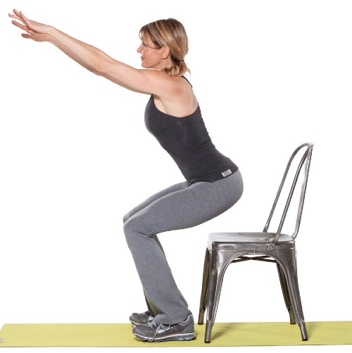 Descendo a partir dos quadris como se fosse sentar e com os braços estendidos para fora e na frente do corpo, dobrar os joelhos e abaixar até que o bumbum toque a cadeira. Pausar e impulsionar-se através dos calcanhares para retornar à posição inicial. Contrair os glúteos na parte alta do movimento.