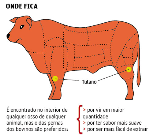 O tutano é uma parte que fica na região da perna do boi e preenche as suas cavidades ósseas, ou seja, localiza-se dentro do osso do animal. Os tutanos dos animais são conhecidos por serem macios, gelatinosos, gordurosos e de sabor intenso, entretanto, o tutano bovino apresenta um gosto mais suave.