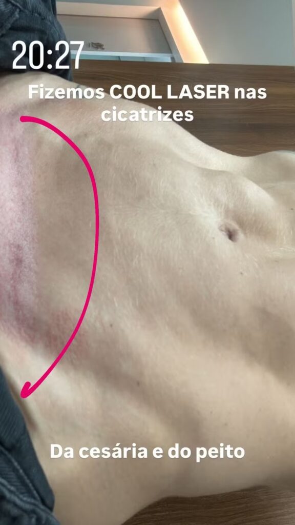 A influenciadora digital mostrou o abdômen com o resultado de uma sessão de cool laser. Ela disse que fez o procedimento para cuidar das cicatrizes de suas cesáreas e de cirurgias nos seios. “Fizemos cool laser nas cicatrizes. De cesárea e do peito”, escreveu na legenda.