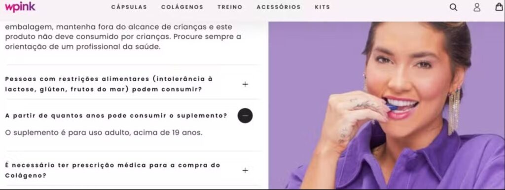 No site do WPink, marca de Virginia e responsável por comercializar o produto, o colágeno em pó é indicado para maiores de 19 anos. Geralmente, o uso da substância é aconselhada a partir dos 30, idade que começa a ocorrer uma redução progressiva e natural da produção da proteína, levando ao surgimento de rugas e linhas de expressão e podendo causar rigidez nas articulações e consequências em outros lugares como ligamentos e ossos.