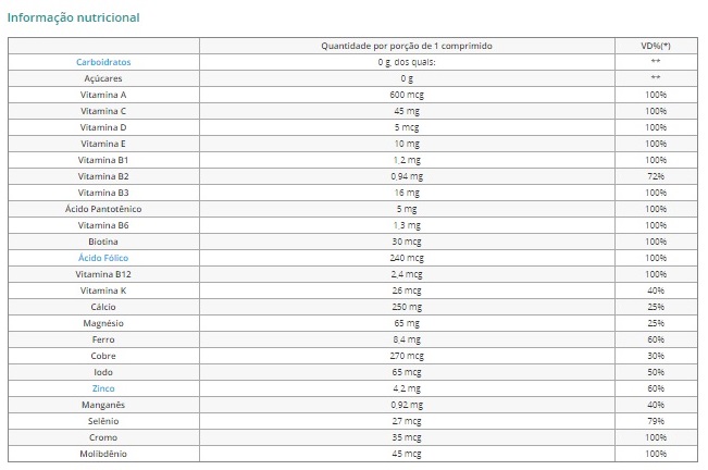 Agora que já sabemos o que é e para que serve o suplemento, chegou a hora de conhecermos a composição de Supradyn. Dê uma conferida na tabela a seguir: